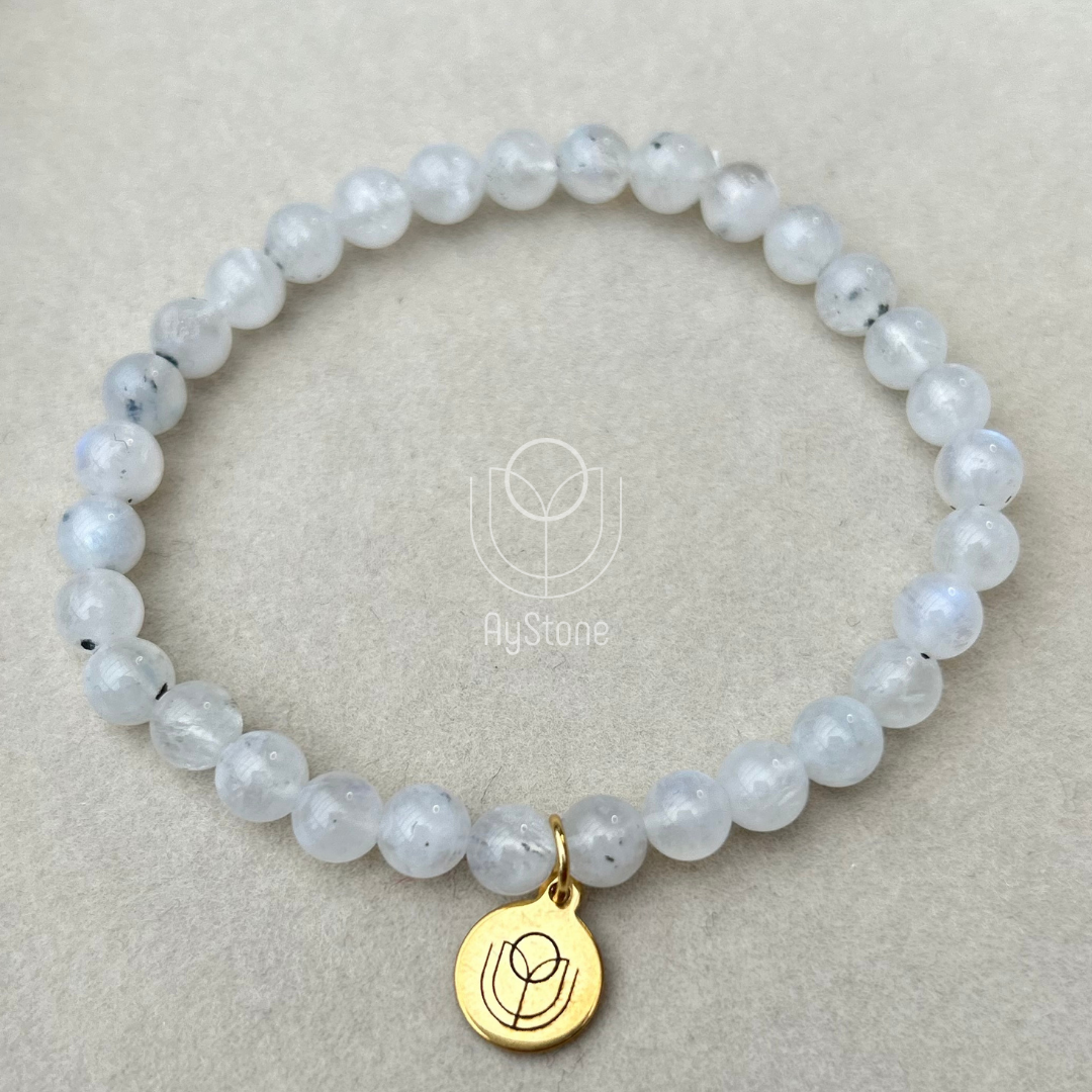 Dieses Edelsteinarmband bestehen aus glänzenden Mondstein Kugeln mit einem Durchmesser von 6 mm und einem Umfang von 18 cm.